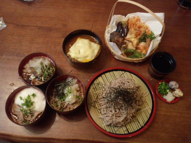 時盛の踊り子そばに見立てた「とろろ」「のりおろし」「おろし山菜」の三種類と、最近私がハマってる「カレーそば」と時盛を意識した「天ざる」。